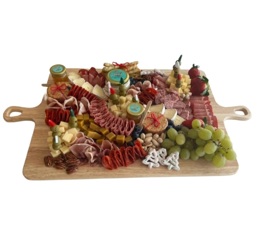 Queso Brie, Gouda, Manchego Semicurado, Provolone, Salami grueso y delgado, Lomo embuchado, jamón serrano, Chorizo de Pamplona, galletas, grissinis, pistaches, nueces, aceitunas, mermelada y fruta de temporada.
