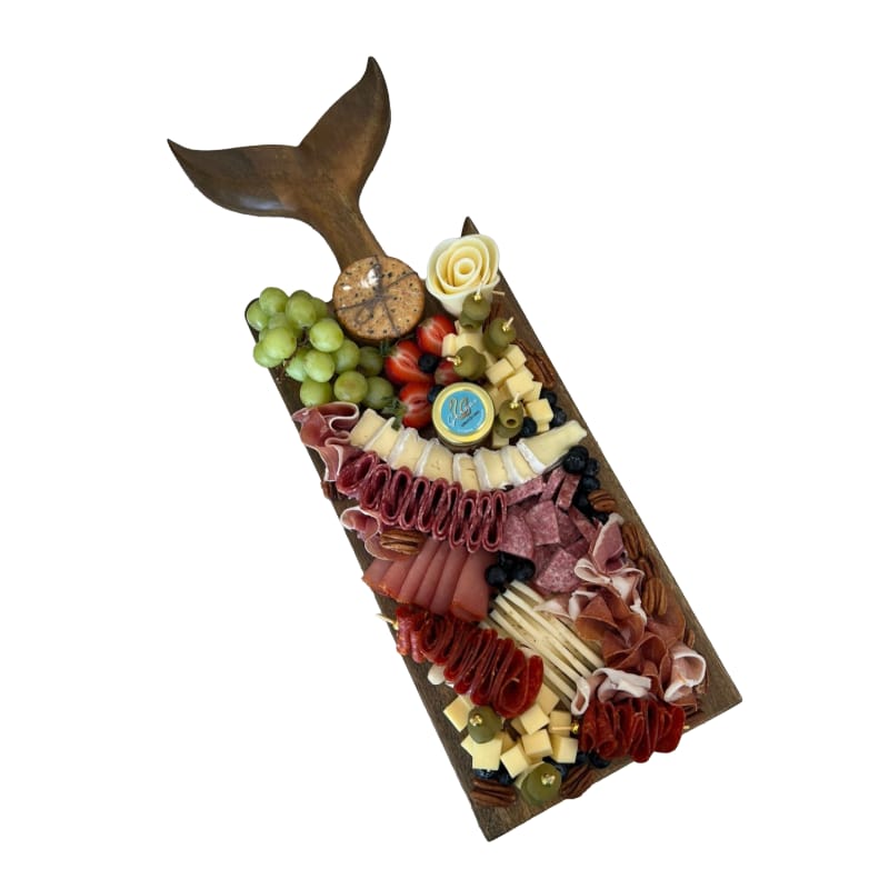 Queso Provolone, Gouda, Brie, Salami grueso y delgado, Lomo embuchado, Jamón Serrano, Chorizo de Pamplona, Galletas, Grissinis, Mermelada, Pistaches, Nuez, Aceitunas y Fruta de temporada.