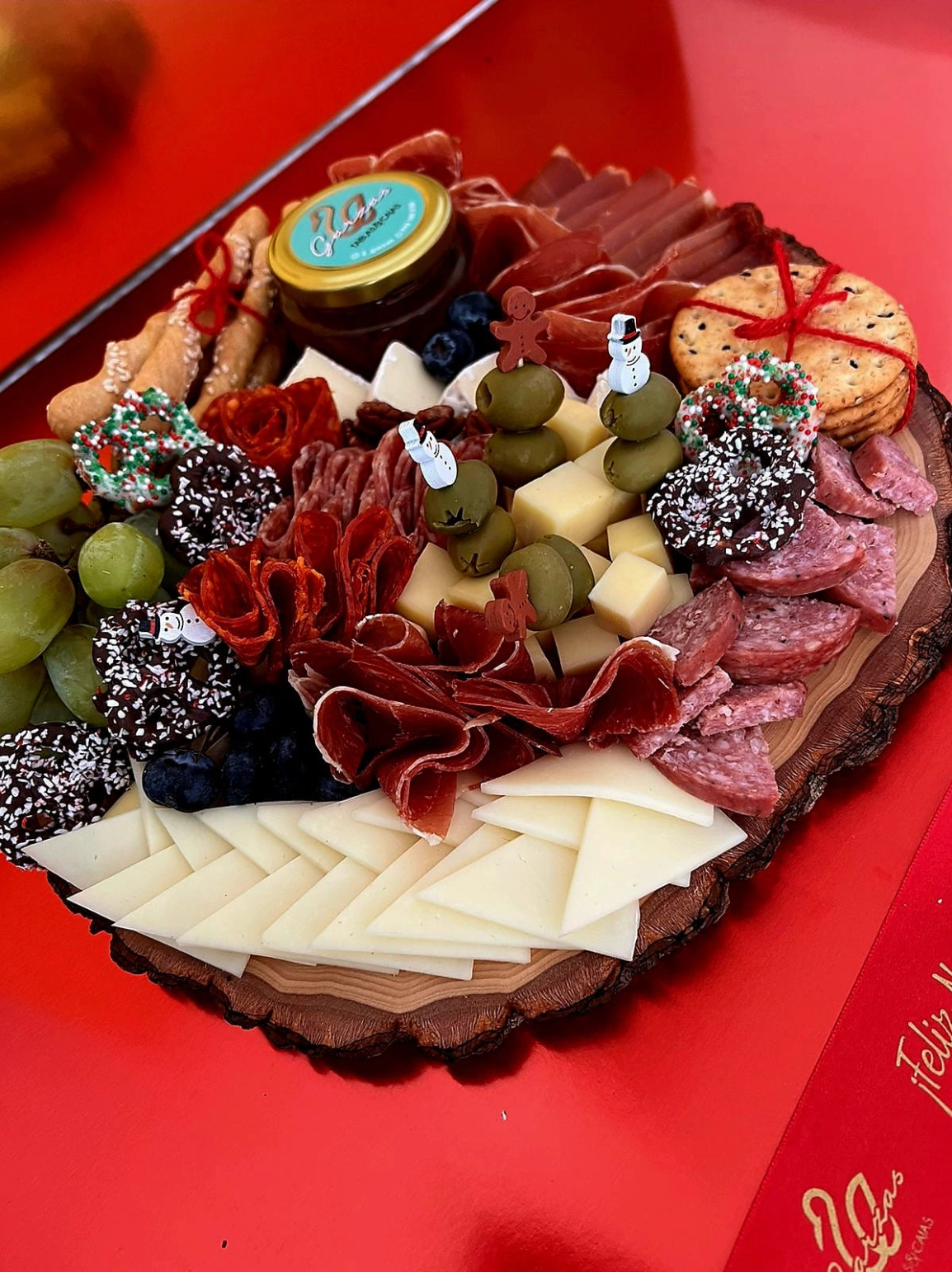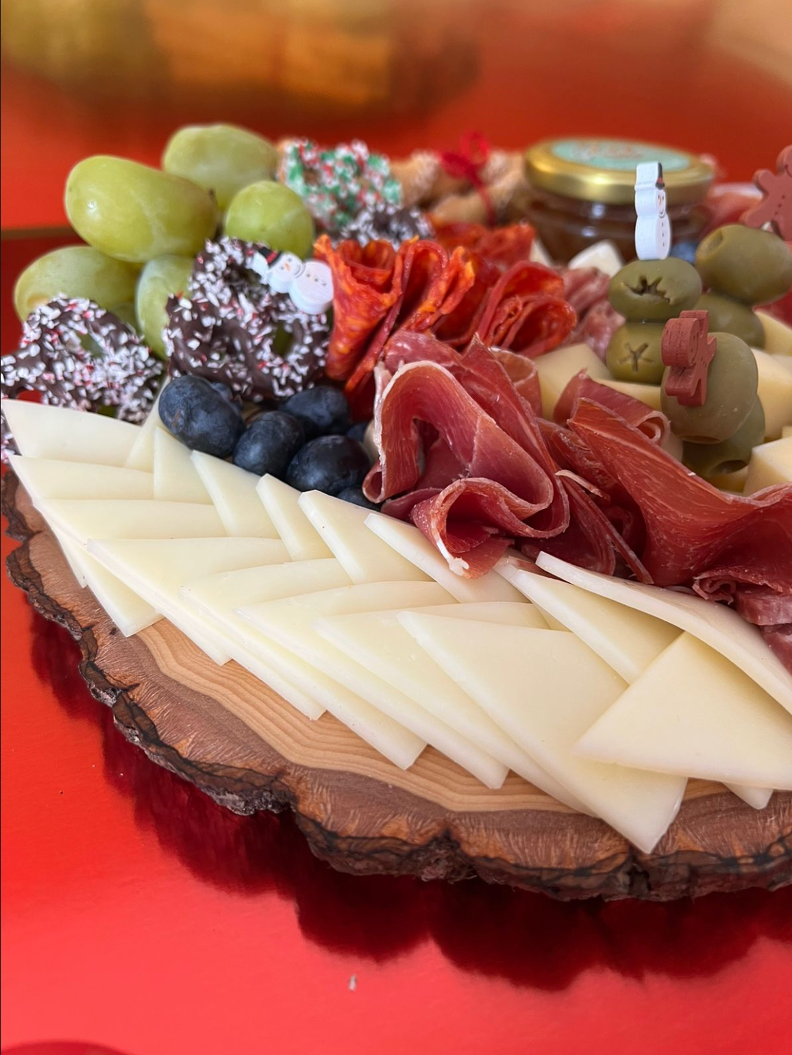 Queso Brie, Gouda, Manchego con nuez, Provolone, Salami grueso y delgado, Lomo embuchado, Jamón Serrano, Chorizo de Pamplona, Galletas, Grissinis, Pretzels con chocolate, Pistaches, Nueces, Aceitunas, Mermelada y Fruta de temporada.